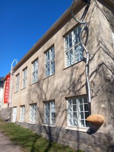 Taideteos on kiinnitetty rakennuksen seinään.