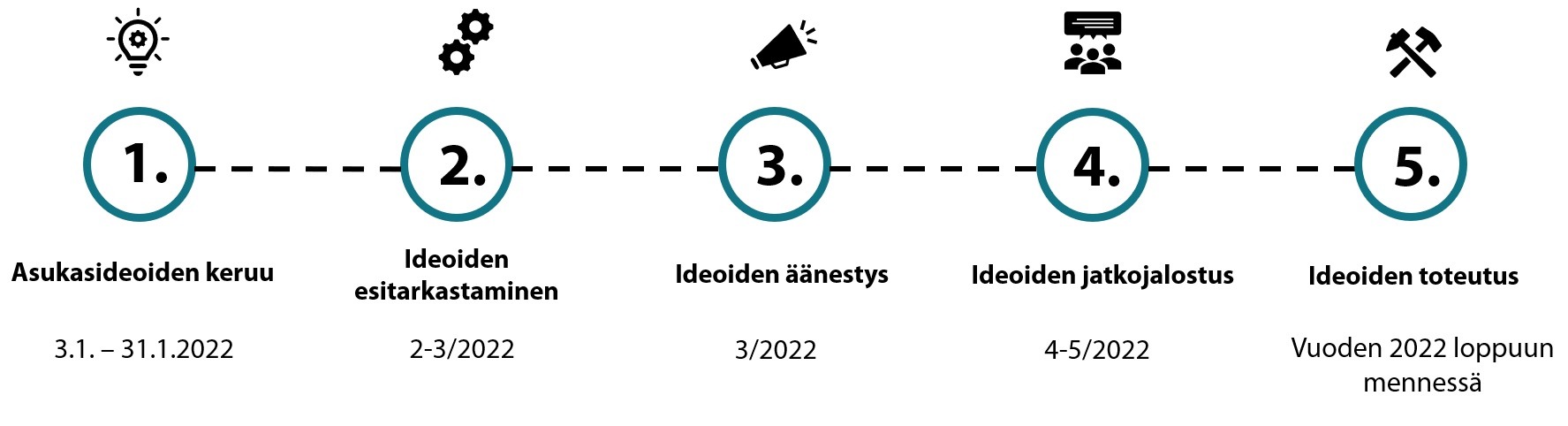 Alueittain äänestyksen voittaneita asukasideoita työstetään vielä yhdessä huhti-toukokuun aikana kunnan asiantuntijoiden ja asukkaiden kesken. Ideoiden jatkojalostuksessa tarkennetaan muun muassa toteutukseen liittyviä yksityiskohtia, kustannuksia ja mahdollisia yhteistyön muotoja. Ideoiden yhteiskehittämisen toteutusmuoto tarkentuu lähiaikoina.